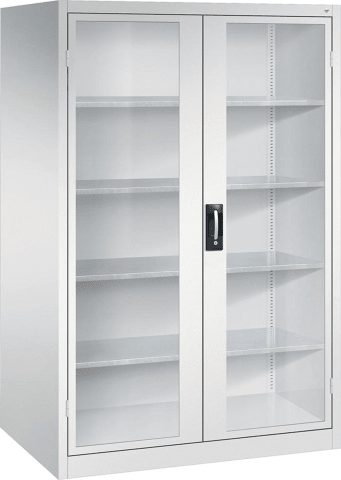 Schwerlastschrank, mit Flügeltüren • Material: Stahlblech mit hochwertiger Einbrennbeschichtung • Sichtfenster: 3-mm-Acrylglas, fest verklebt, verdeckte Schließstangen • Türen: Scharniere außen liege