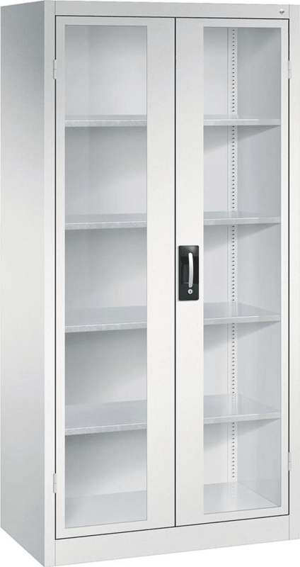 Schwerlastschrank, mit Flügeltüren • Material: Stahlblech mit hochwertiger Einbrennbeschichtung • Sichtfenster: 3-mm-Acrylglas, fest verklebt, verdeckte Schließstangen • Türen: Scharniere außen liege