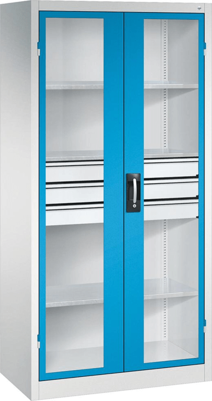 Schwerlastschrank mit Flügeltüren und Schubladenblock mittig • Material: Stahlblech mit hochwertiger Einbrennbeschichtung • Sichtfenster: 3-mm-Acrylglas, fest verklebt, verdeckte Schließstangen • Tür