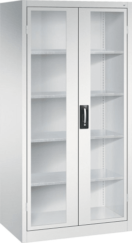 Schwerlastschrank, mit Flügeltüren • Material: Stahlblech mit hochwertiger Einbrennbeschichtung • Sichtfenster: 3-mm-Acrylglas, fest verklebt, verdeckte Schließstangen • Türen: Scharniere außen liege