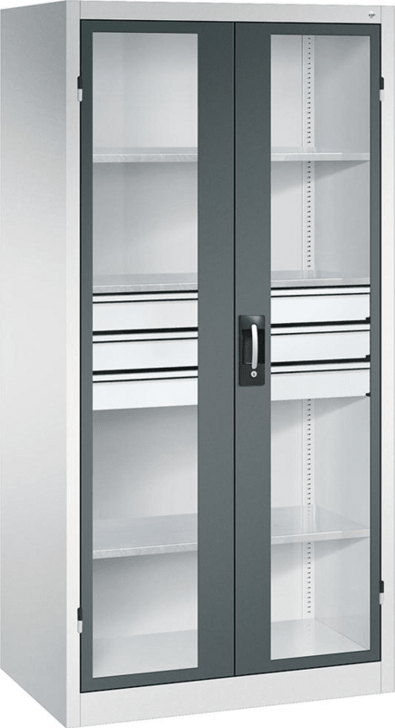Schwerlastschrank mit Flügeltüren und Schubladenblock mittig • Material: Stahlblech mit hochwertiger Einbrennbeschichtung • Sichtfenster: 3-mm-Acrylglas, fest verklebt, verdeckte Schließstangen • Tür