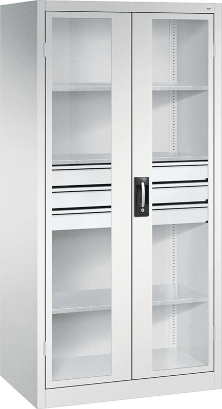 Schwerlastschrank mit Flügeltüren und Schubladenblock mittig • Material: Stahlblech mit hochwertiger Einbrennbeschichtung • Sichtfenster: 3-mm-Acrylglas, fest verklebt, verdeckte Schließstangen • Tür