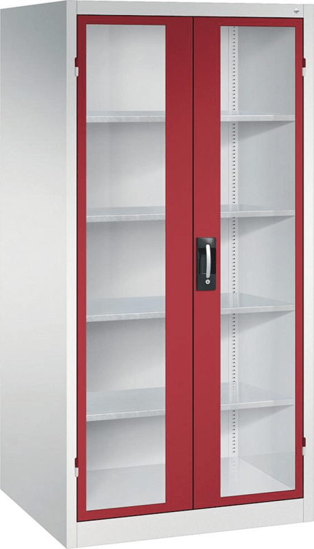 Schwerlastschrank, mit Flügeltüren • Material: Stahlblech mit hochwertiger Einbrennbeschichtung • Sichtfenster: 3-mm-Acrylglas, fest verklebt, verdeckte Schließstangen • Türen: Scharniere außen liege