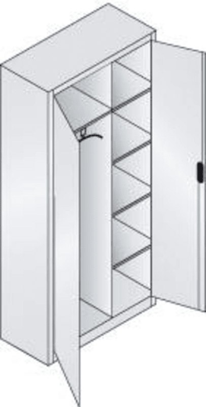 Flügeltürenschrank, mit Inneneinrichtung • Gehäuse: Stahlblech mit hochwertiger Einbrennbeschichtung, RAL 7035 lichtgrau • Verschluss: Patentiertes, 3-riegeliges Griffschloss Ergo-Lock 4.0 mit 2 Schlüsseln • Türen: in Drehbolzen gelagert, mittige Kastenversteifung, Öffnungswinkel ca. 110° • Ablageboden und ausziehbare Garderobenstange (links) • 4 Einlegeböden (rechts)