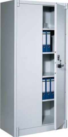 Flügeltürenschrank, feuergeschützt • Material: Stahlkonstruktion mit hochwertiger Einbrennbeschichtung, RAL 7035 lichtgrau • Gehäuse: allseitig doppelwandig (zwischen den Wandungen 25 mm starke Spezial-Isolierplatten, Klasse A1, nicht brennbar nach DIN 4102), Schutz vor leichten Bränden und Einbruchversuchen • Tür: oben und unten in stabilen Drehbolzen lagernd • Bolzenwerk: 5-riegelig • Doppelbart-Sicherheitsschloss: mit 2 Schlüsseln • Schrankgriff: schwarz • 4 Einlegeböden: verstellbar, Tragkraft pro Boden ca. 70 kg • Ordnerhöhen: 5 Hinweis: Verbesserte Einbruchsicherheit: durch stabile Türsicherungen, die links und rechts in die Seitenwände einrasten.