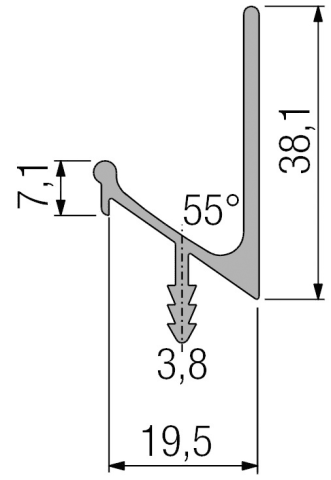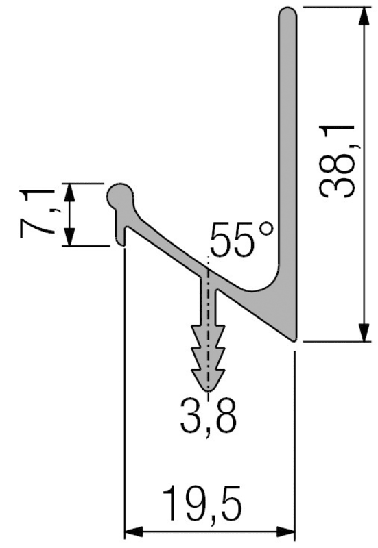 FORMAT, Möbel-Griffleiste, Modell: C2, Ausführung: mit Harpunensteg, Länge: 2.500 mm, Höhe: 38,1 mm, Tiefe: 19,5 mm, Material: Aluminium, Farbton: silber, Oberfläche: eloxiert, Nutbreite: 3,5 mm,: 19 mm, Montage: Harpunensteg wird in die Nut gepresst