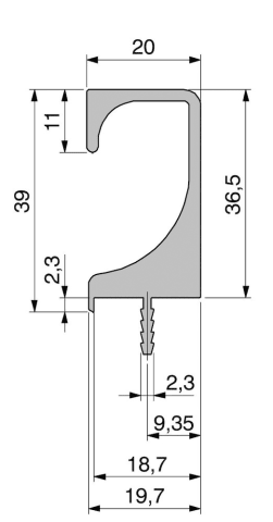 FORMAT, Möbel-Griffleiste, Modell: A, Ausführung: mit gefrästen Stegenden, Länge: 395 mm, Höhe: 36,5 mm, Tiefe: 20 mm, Material: Aluminium, Farbton: silber, Oberfläche: eloxiert, Nutbreite: 2 mm, Montage: Harpunensteg wird in die Nut gepresst,: Profile auf Frontmaße abgelenkt