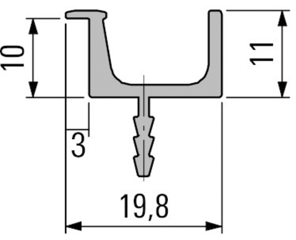 FORMAT, Möbel-Griffleiste, Modell: L04, Anwendung: für Holz und MDF-Fronten, Ausführung: mit Harpunensteg, Länge: 2.500 mm, Breite: 19,8 mm, Höhe: 10 + 11 mm, Material: Aluminium, Farbton: silber, Oberfläche: eloxiert, Nutbreite: 2 mm,: 19 mm, oder 16 mm plus Sonderfront 4 mm, Montage: Harpunensteg wird in die Nut gepresst