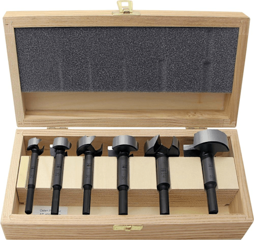 Forstnerbohrer-Satz WAVE-Cutter WS, mit Wellenschlif • Geschmiedete Ausführung • Zentrierspitz • 2 Hauptschneide • 2 Peripherieschneiden mit Wellenschlif • Abgesetzter zylindrischer Flächenschaf • Geringere Temperaturentwicklung und hohe Standzei • DIN 7483 • Zum Bohren von Löchern, für Randbohrungen sowie für Sacklöcher in Weich- und Harthol Lieferung: In Holzkassette Inhalt: 6 Forstnerbohrer 20; 25; 30; 35; 40; 50 mm.