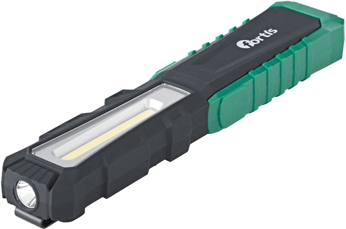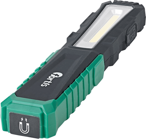Akku-LED-Arbeitsleuchte• Haupt-/Punktlicht fest verbaute COB-LED • Leuchtstärke in 2 Stufen (100/55 %) einstellbar • Gummiertes Kunststoffgehäuse • 220° schwenkbarer Standfuß • Magnet zur Befestig