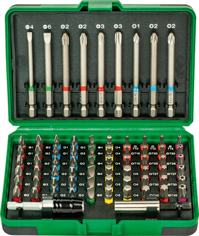 Bit-Sortiment, gemischt, mit Farbring• S2-Stahl • Für Maschinen- und Handbetätigung • Mit langen Bits im Deckel für tiefer sitzende Schrauben • Verchromt und mit Farbring für leichtere Zuordnung de