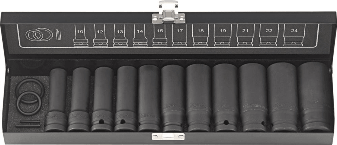 Kraft-Steckschlüssel-Garnitur 1/2", lang• Phosphatiert • Chrom-Molybdän-Stahl • DIN 3129 Lieferung: Im Stahlblechkasten. Inhalt: 11 6-kant-Kraft-Steckschlüssel-Einsätze 10; 12; 13; 14; 15; 17;