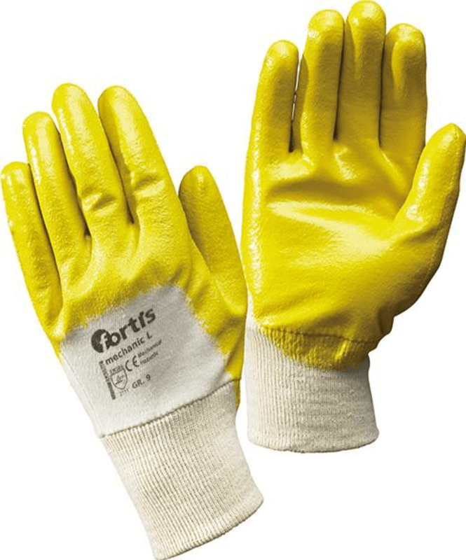 FORTIS Nitrilhandschuh Mechanic L, leicht, gelb. Trägergewebe: 100 % Baumwolle, hohe Abriebfestigkeit. Besonders gutes Tastgefühl durch extrem dünne und leichte Nitril-Beschichtung. Anwendungsbereiche: Landwirtschaft, Gartenbau, Verpackungsindustrie, Tankstellen und Reparaturen. Schutz nach Kategorie 2, EN 388.