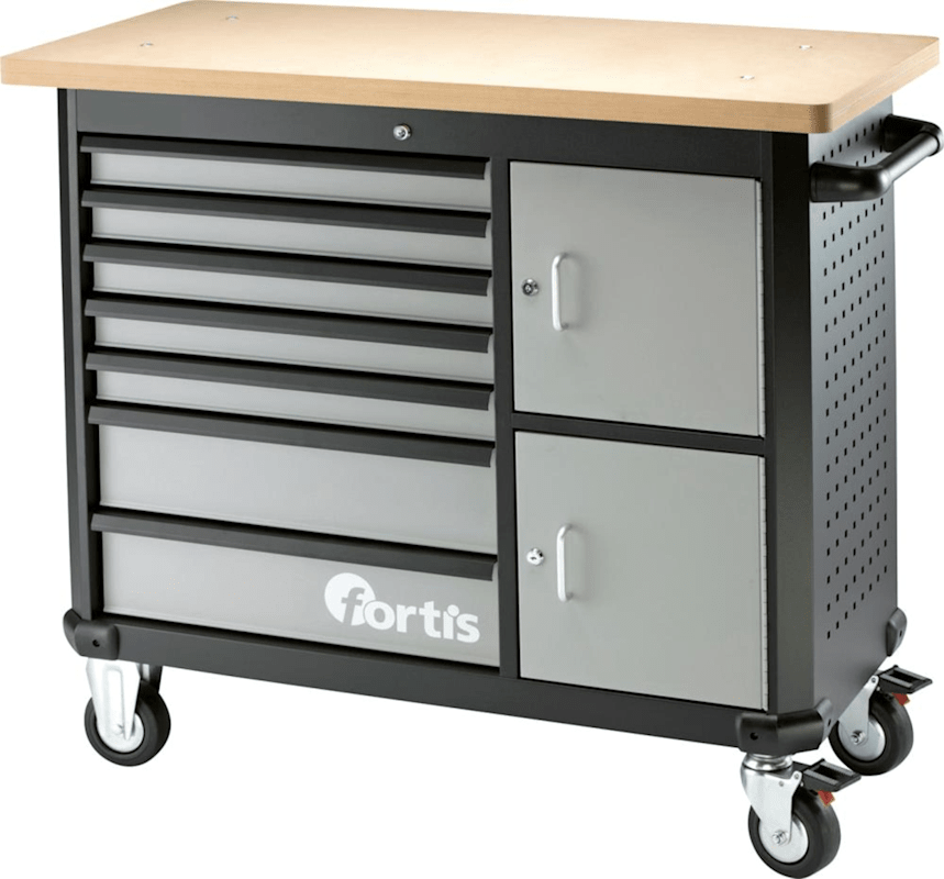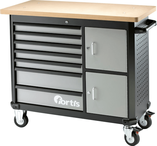 Werkstattwagen• Stabile Stahlblechkonstruktion • Oberfläche pulverbeschichtet • Arbeitsplattform mit MDF-Platte • Mit Kunststoff-Schutzecken an der Unterseite des Korpus • 2 Laufrollen und 2 Lenkr