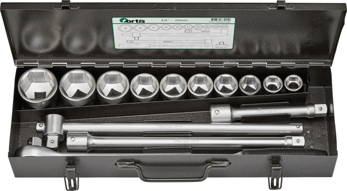 Steckschlüssel-Garnitur 3/4"• Verchromt • Chrom-Vanadium-Stahl • DIN 3124, ISO 2725-1 • 4-kant-Antrieb DIN 3120-C 20, ISO 1174 • Stiftsicherung • 6-kant mit Eckenverrundung zur Schonung des Schra