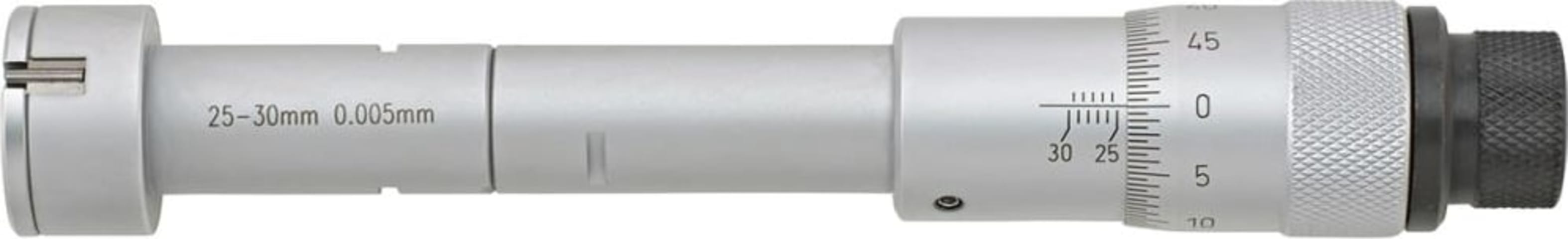 3-Punkt-Innenmessschraube• DIN 863 • Ableseteile matt verchromt • Messflächen HM-bestückt • Messkraftregelung durch Gefühlsratsche • Für Durchgangs- und Grundlochbohrungen • Selbstzentrierender