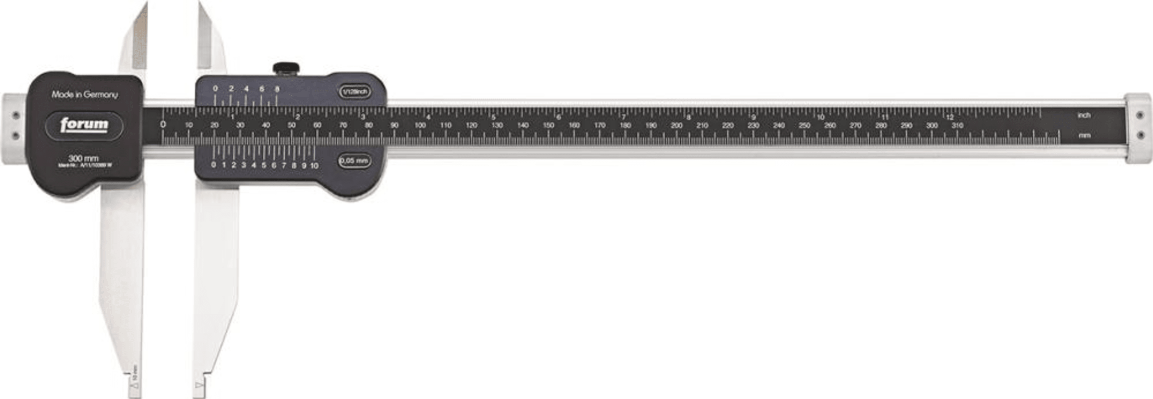 Werkstattmessschieber, Leichtmetall• DIN 862 • Hauptteilung gegen Abnutzung leicht vertieft liegend • Weiße Skalierung auf schwarzer Fläche • Messschenkel aus Stahl, rostfreiem, gehärtetem und fein