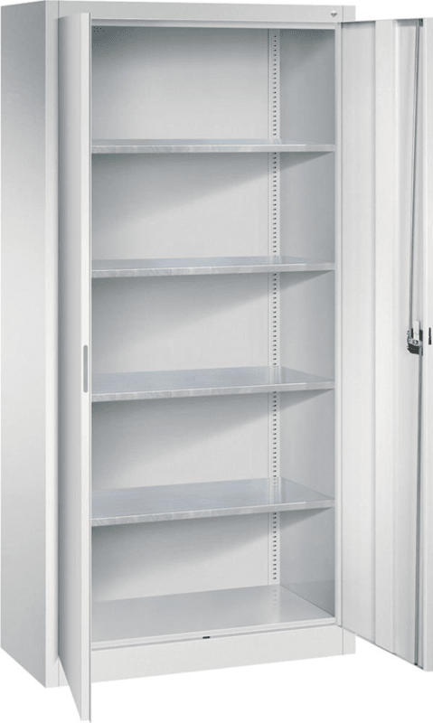 Flügeltürenschrank, Tragkraft Fachboden 70 kg • Vielseitige Verwendungsmöglichkeit • Stabiler Stahlkorpus • Hochwertige Einbrennbeschichtung • Türen: mit mittiger Türverstärkung für eine hohe Stabilität • Türöffnungswinkel: 110° • Schloss: sicherer dreiriegeliger Rundgriffverschluss inkl. 2 Schlüssel, einzelschließend (auf Anfrage gleichschließend) • Anzahl Fachböden: 4, verzinkt, höhenverstellbar im 15-mm-Raster • Traglast pro Boden: ca. 70 kg (bei gleichmäßig verteilter Last)