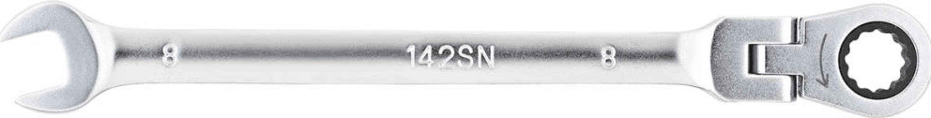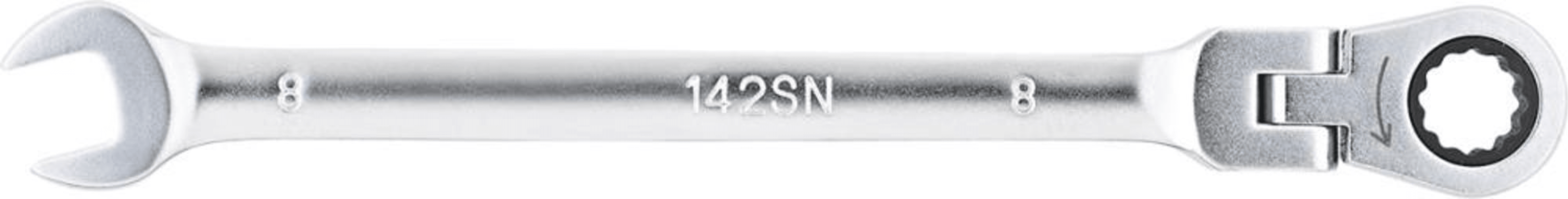 Gelenk-Maul-Ringratschen-Schlüssel• Matt verchromt • Chrom-Vanadium-Stahl • Geschmiedet • Griffig, geprägter Profilschaft • Mit Gelenk auf der Ringseite, um 180° schwenkbar • Maulstellung 15° abg