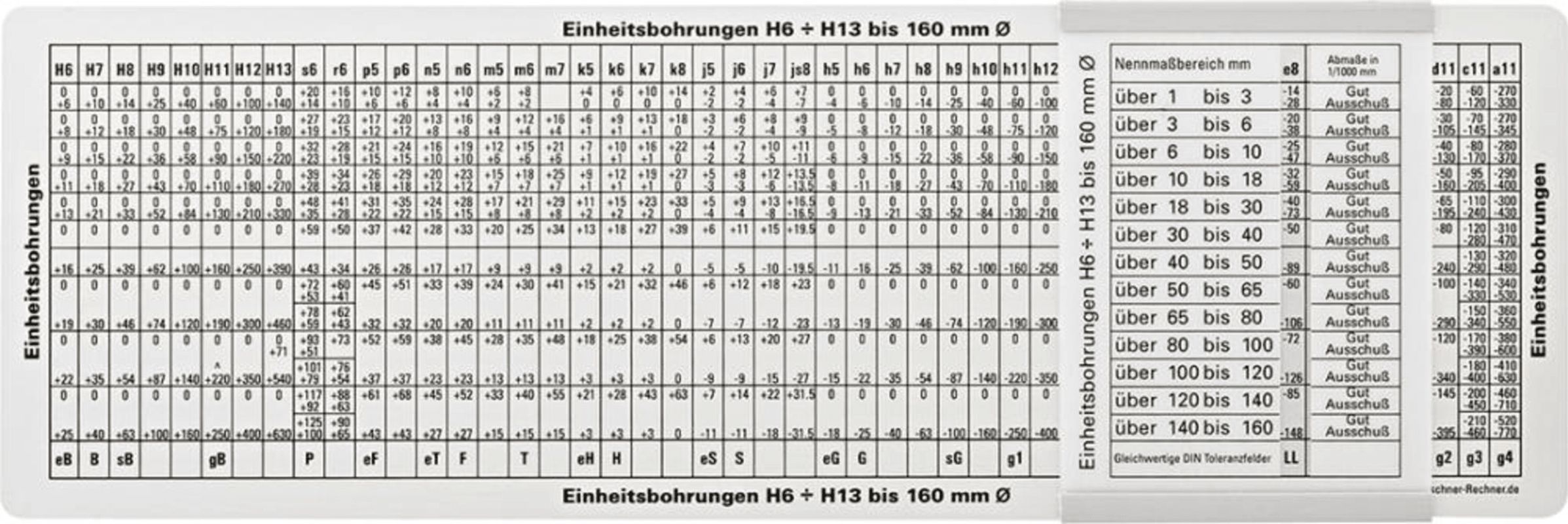 • Mit Tabellen auf Vorder- und Rückseite für Einheitsbohrungen H6 bis H13 nach DIN 7154 von 1–160 mm Ø sowie Einheitswellen h5 bis h12 nach DIN 7155 von 1–160 mm Ø