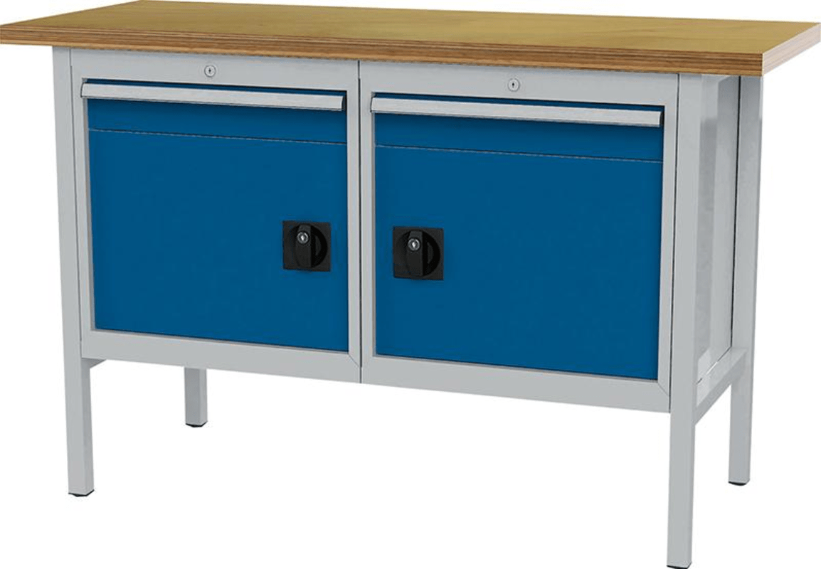 Kastenwerkbank, Breite 1500 mm, 2 Schubladen, 2 Türen• Arbeitsplatte: Buche Multiplex, wasserfest, gedämpft und geölt • Gehäusemaß B x H: 600 x 620 mm • Stärke Arbeitsplatte: 40 mm • Gestell: aus V