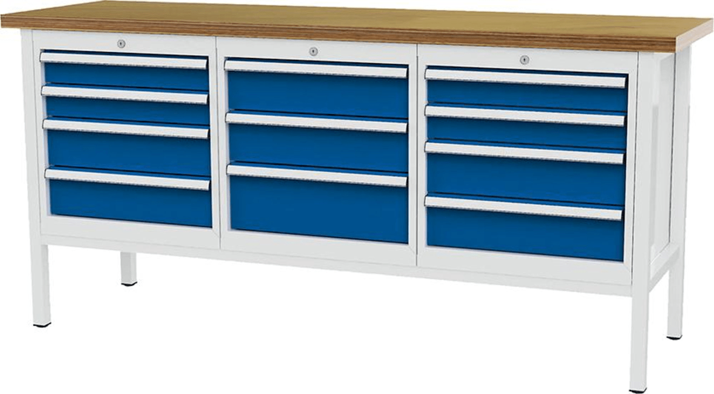 Kastenwerkbank, Breite 2000 mm, 11 Schubladen• Arbeitsplatte: Buche Multiplex, wasserfest, gedämpft und geölt • Stärke Arbeitsplatte: 40 mm • Gehäusemaß B x H: 600 x 620 mm • Gestell: aus Vierkantr