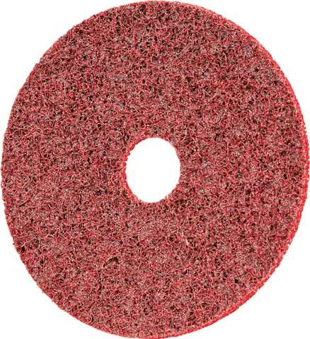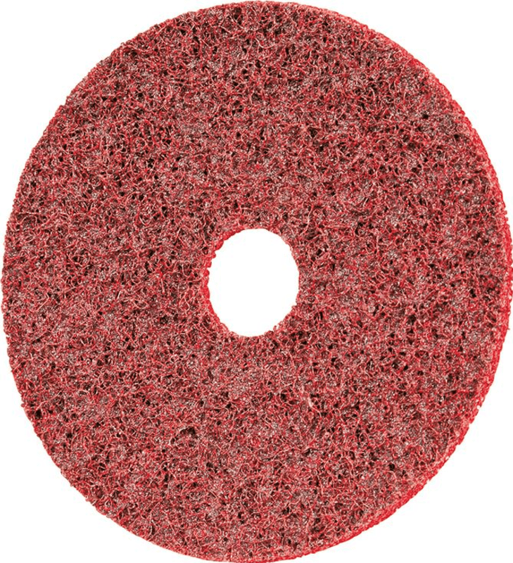 Klett-Vliesschleifscheibe, Keramikkorund• Keramikkorund (K80) • Faservlies • Gewebeunterlage mit vorgestanztem Innenkern, dadurch herausnehmbar (Zentrierung) • Bessere Haftung und genauere Position