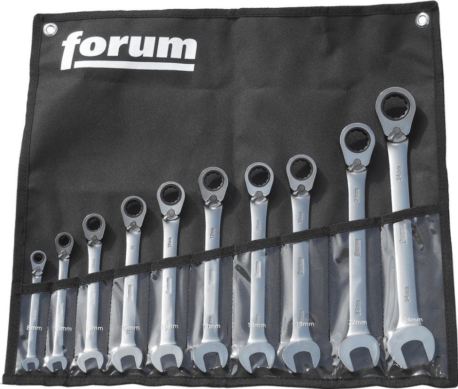 Inhalt: 10 Maul-Ringratschen-Schlüssel 8; 10; 13; 15; 16; 17; 18; 19; 22; 24 mm.
