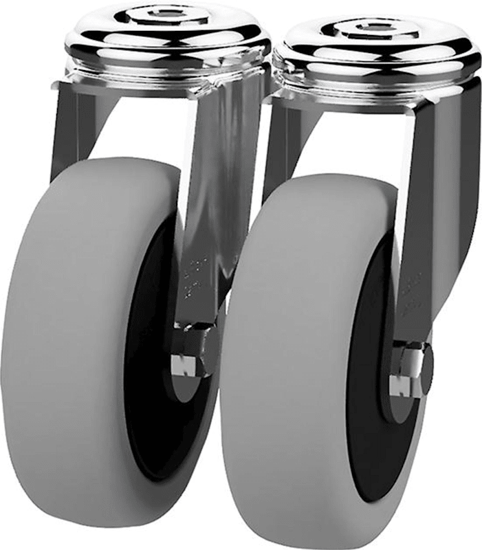 • 4 Lenkrollen, Ø 125 mm, 2 davon mit Feststeller, sowie ein Schiebegriff