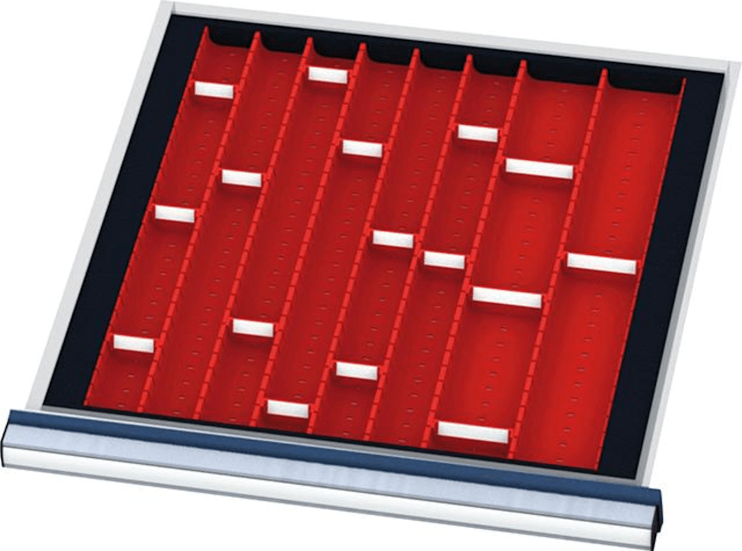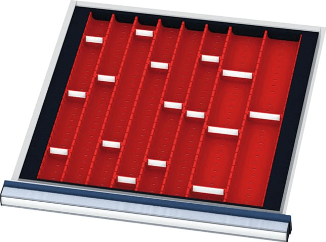 Muldenplatten für Schubladen• Inklusive Distanzschienen3 Muldenplatten mit 2 Mulden, 4 Steckwände, 6 Muldenplatten mit 3 Mulden, 12 Steckwände, inkl. Distanzschienen