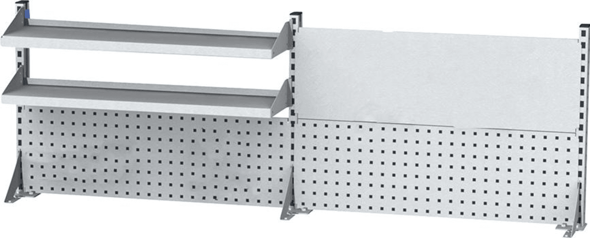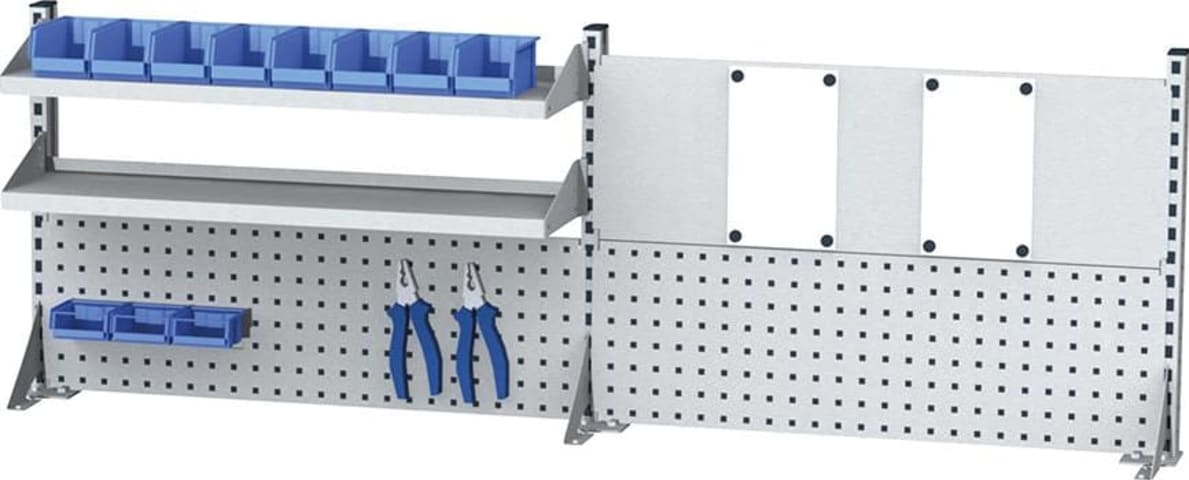 Multi-Wand-Aufbau, Breite 2000 mm, 2 Lochwände, 2 Fachböden, 1 Magnetwand• Lochplatte: Lochung 10 x 10 mm, quadratisch, Abstand 38 zu 38 mm • 3 Tragsäulen 650 mm • 2 Lochwände 1000 x 302 mm • 2 Fac