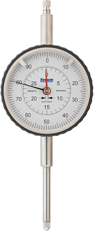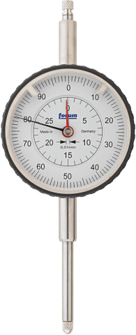 FORUM Messuhr mit großem MessbereichGenauigkeit nach Werksnorm. Genauigkeitskontrolle mit auf nationale und internationale Normale rückführbaren Prüfmitteln. Messbolzen und Einspannschaft (Ø 8 mm h6) geläppt und aus gehärtetem, nichtrostendem Stahl. Gehäuse aus Messing, mattvernickelt, unzerbrechliche Gläser, die wesentlichen Stellen der Messwerke sind in Lochsteinen aus Keramik gelagert.Lieferumfang: Messuhr, Etui.