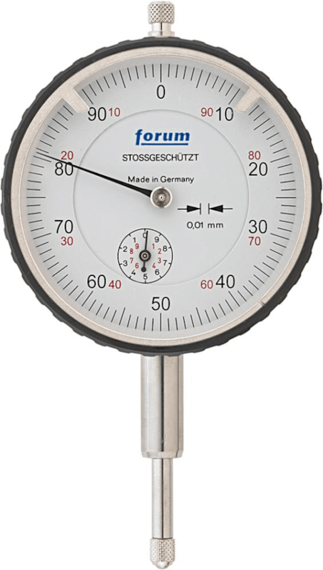 Präzisions-Messuhr, stoßgeschützt• DIN 878 • Gehäuse aus Messing, matt vernickelt • Einspannschaft Ø 8 mm h6, gehärtet und geschliffen • Messbolzen geläppt • Unzerbrechliche Gläser • Drehbares Zi