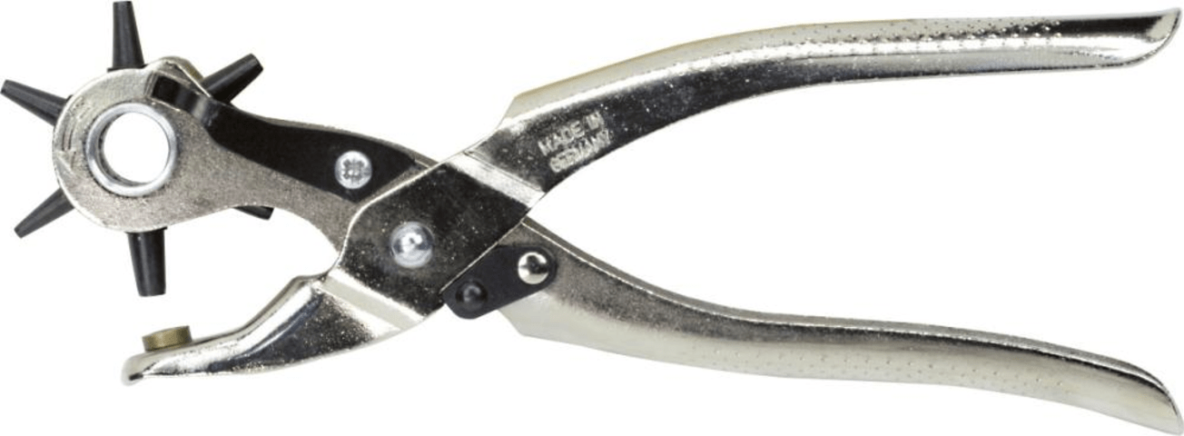 Revolverlochzange• Vernickelt • Spezialstahl • Einhandbedienung • 6 auswechselbare Lochpfeifen • Zum Lochen von Leder, Pappe, Gummi, Stoff usw.