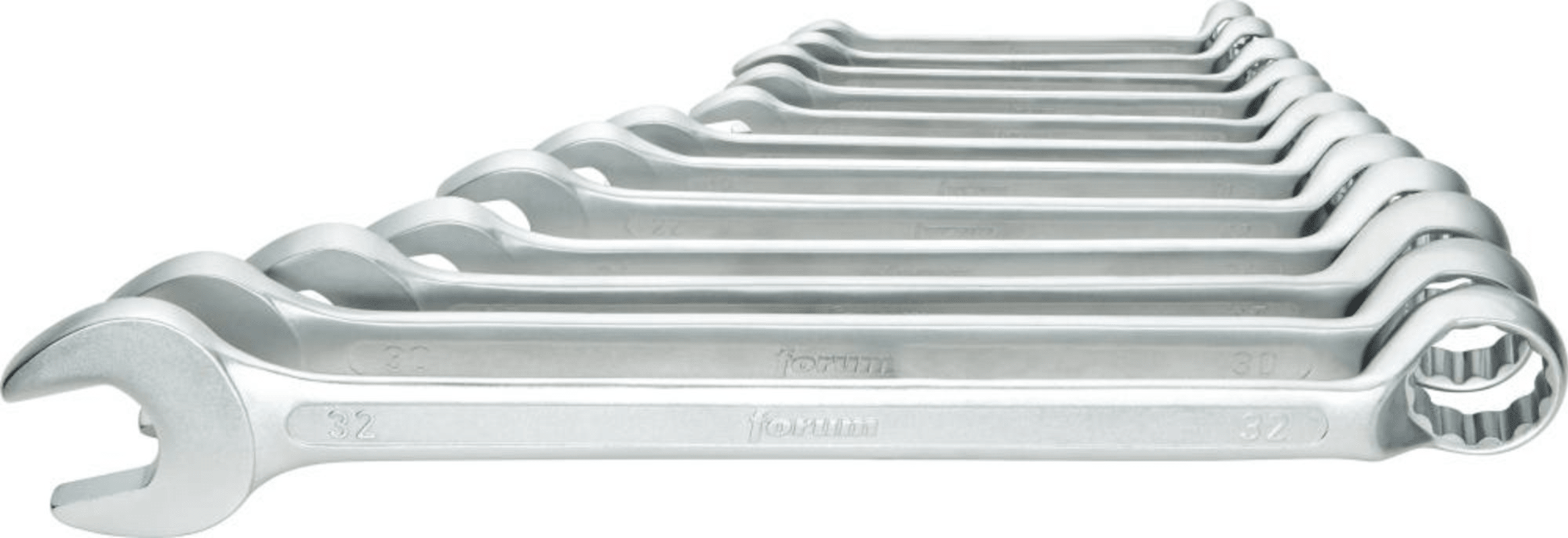 Ring-Maulschlüssel-Satz• Matt verchromt • Chrom-Vanadium-Stahl • Geschmiedet • Maulstellung 15° und Ringstellung 10° abgewinkelt • Ringseite tief gekröpft • Griffiger, ovaler Schaft • DIN 3113 B