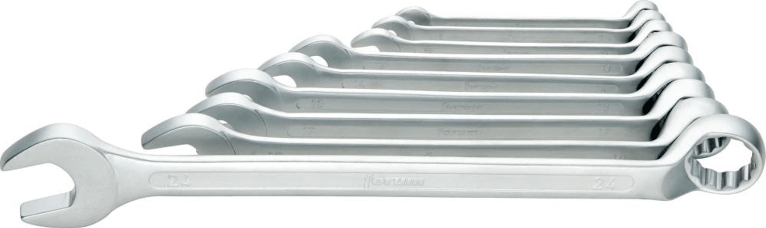 Ring-Maulschlüssel-Satz• Matt verchromt • Chrom-Vanadium-Stahl • Geschmiedet • Maulstellung 15° und Ringstellung 10° abgewinkelt • Ringseite tief gekröpft • Griffiger, ovaler Schaft • DIN 3113 B