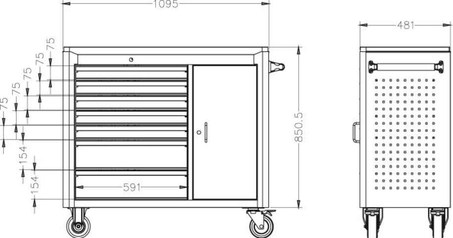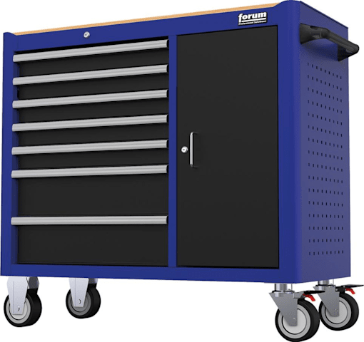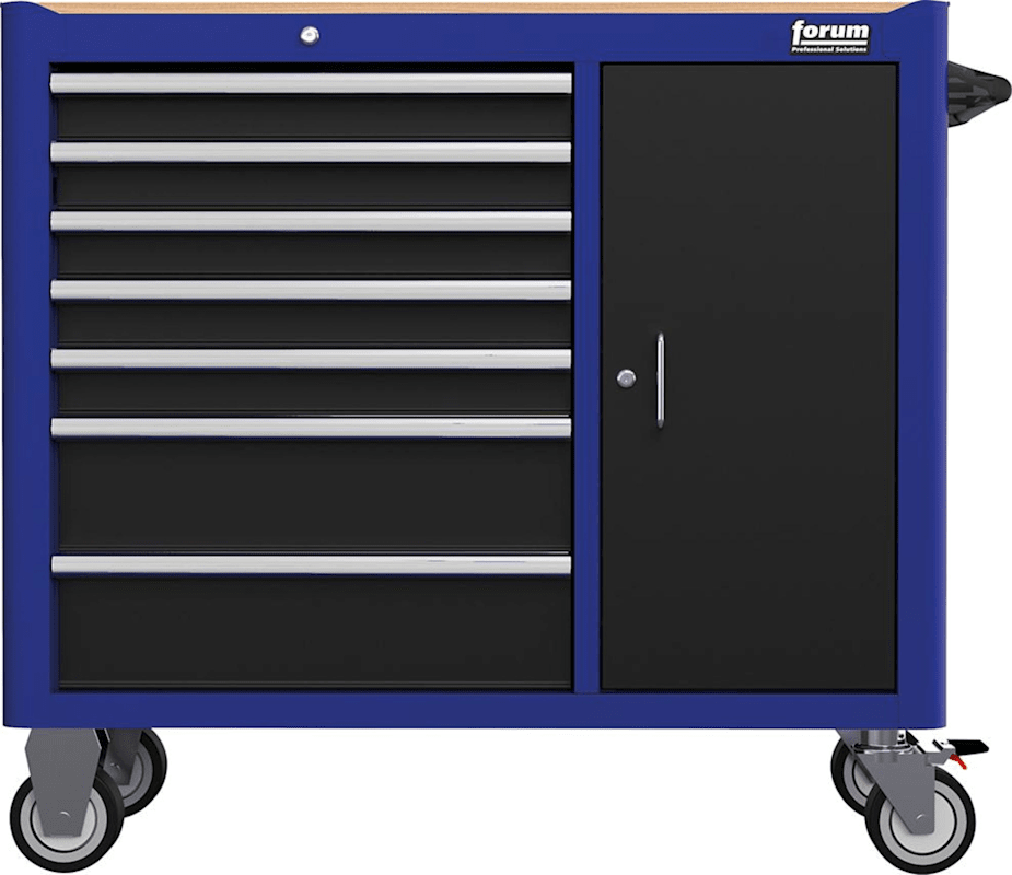 Rollwerkbank• Stabile Stahlblechkonstruktion • Oberfläche pulverbeschichtet • Arbeitsplatte aus 40 mm starkem MDF • 2 kugelgelagerte Bockrollen und 2 Lenkrollen mit Feststellbremse und Totalstopp