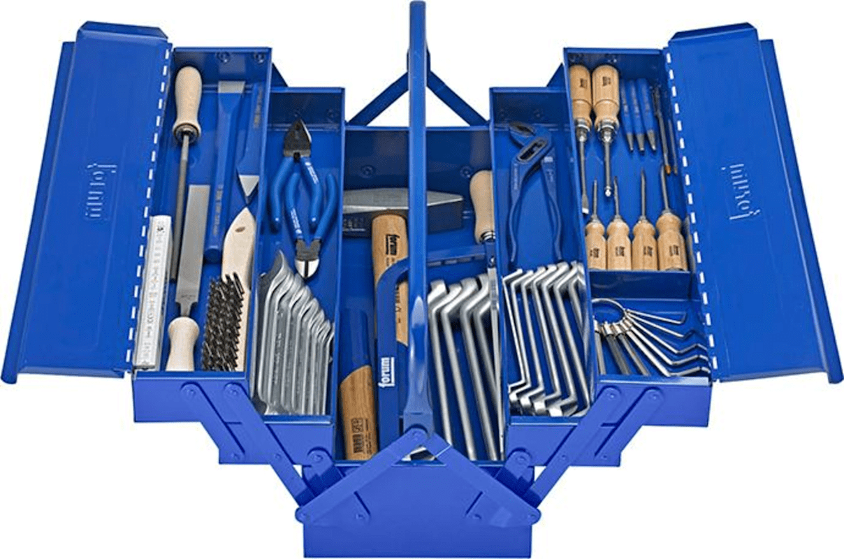 FORUM Schlosser Werkzeugsatz, 57-teiligLieferung im Stahlblech-Werkzeugkasten, 530 x 200 x 200 mm, 5-teilig.Je 1 Stück:Wasserpumpenzange 250 mm Kombizange 180 mm Seitenschneider 160 mm Doppelmaulschlüssel-Satz 10-teilig, SW 6-27 mm Doppelringschlüssel-Satz 12-teilig, SW 6-32 mm Sechskant-Winkelschraubendreher-Satz 8-teilig, am Ring, SW 2-10 Schraubendreher-Satz 6-teilig, mit Holzheft Körner 120 x 12 mm Durchtreiber 3 mm Durchtreiber 5 mm Schlosserhammer 500 g Schlosserhammer 1.000 g Metallsägebogen 300 mm Handsägeblatt HSS-Bimetall 300 mm HM-Reißnadel 150 mm Stahl-Drahtbürste 4-reihig Werkstattfeile, H2, flachstumpf 200 mm Werkstattfeile, H2, rund 200 mm Feilenhefte (2 Stück) Flachmeißel 300 mm Kreuzmeißel 200 mm Holz-Gliedermaßstab 2 m Vorhangschloss