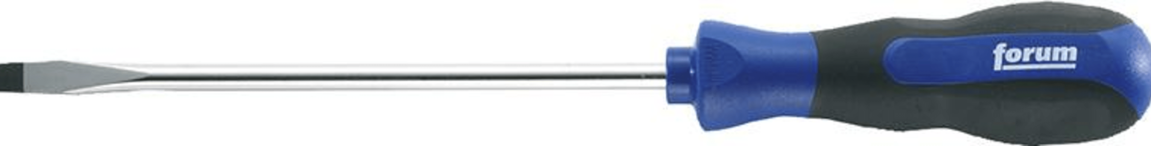 FORUM Schlitz-Schraubendreher mit runder KlingeKlinge aus Chrom-Vanadium-Molybdän-Stahl, glanzverchromt, mit schwarzer Spitze. Mehrkomponenten-Griff mit Abrollschutz und Kopfprägung mit Antriebssymbol und Größe.