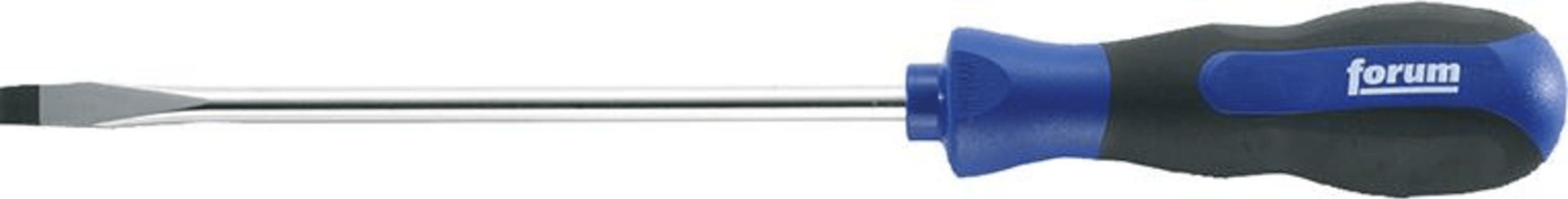 Schraubendreher für Schlitz-Schrauben• Runde Klinge • Glanzverchromt • Chrom-Vanadium-Molybdän-Stahl • Schwarze Spitze • Mehrkomponenten-Griff • Abrollschutz • Kopfprägung mit Antriebssymbol und