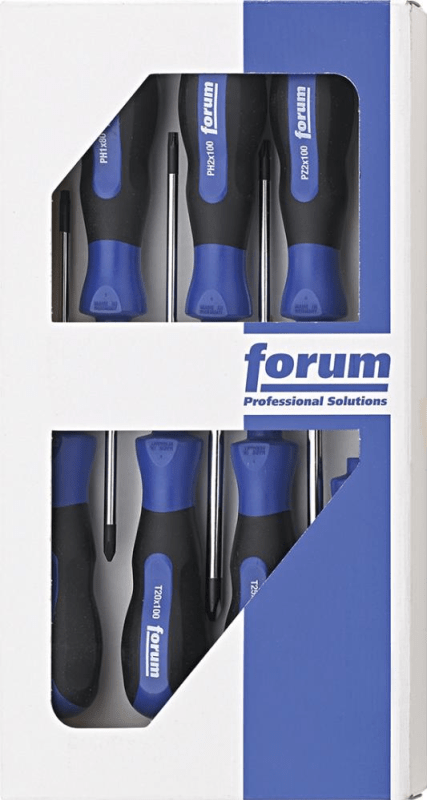 Schraubendreher-Satz• Runde Klinge • Glanzverchromt • Chrom-Vanadium-Molybdän-Stahl • Schwarze Spitze • Mehrkomponenten-Griff • Abrollschutz • Kopfprägung mit Abtriebssymbol und Größe Lieferun
