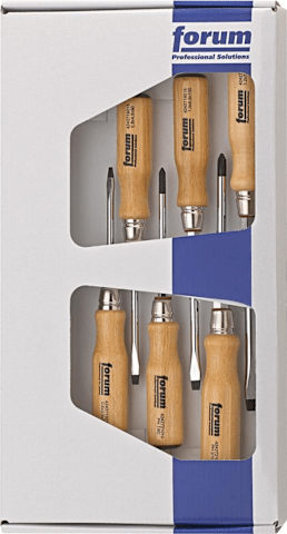 Schraubendreher-Satz für Schlitz-Schrauben, Holzheft• Runde Klinge • Verchromt • Chrom-Vanadium-Stahl • Schwarze Spitze • Buchenholz-Griff, versiegelt, mit Lederkappe • 6-kant-Schlüsselhilfe Li