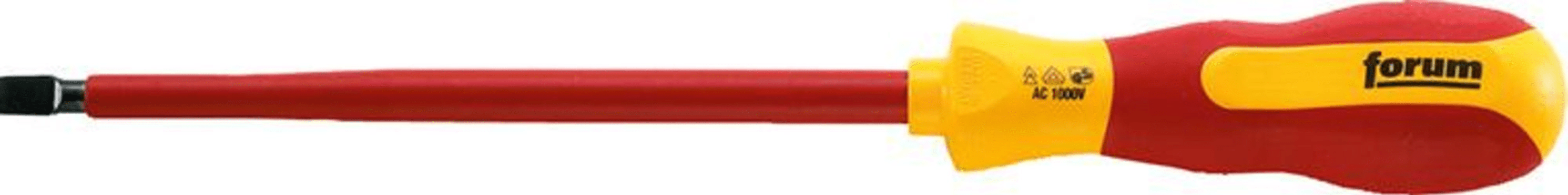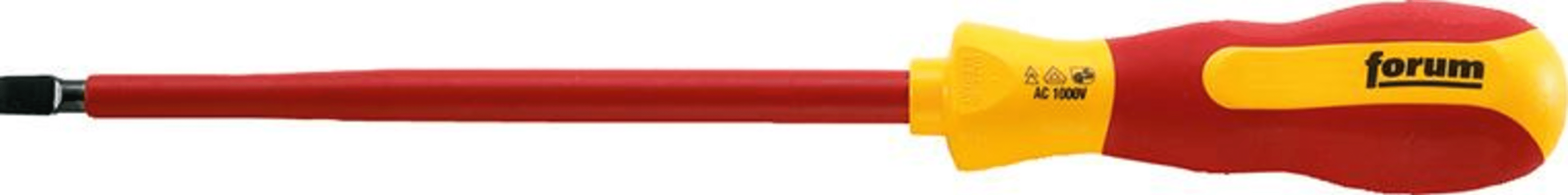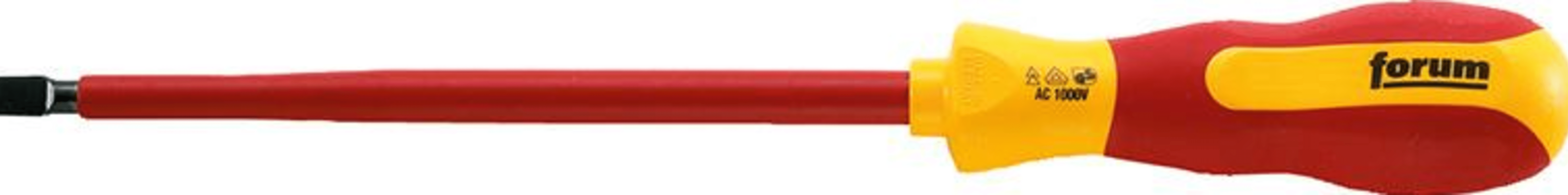 FORUM VDE-Schlitz-SchraubendreherMit runder, isolierter Klinge. Stückgeprüft nach DIN EN 60900 (IEC 60900).Klinge aus Chrom-Vanadium-Molybdän-Stahl, brüniert. Mehrkomponenten-Kraftform-Griff mit Abrollschutz und Kopfprägung mit Antriebssymbol und Größe.