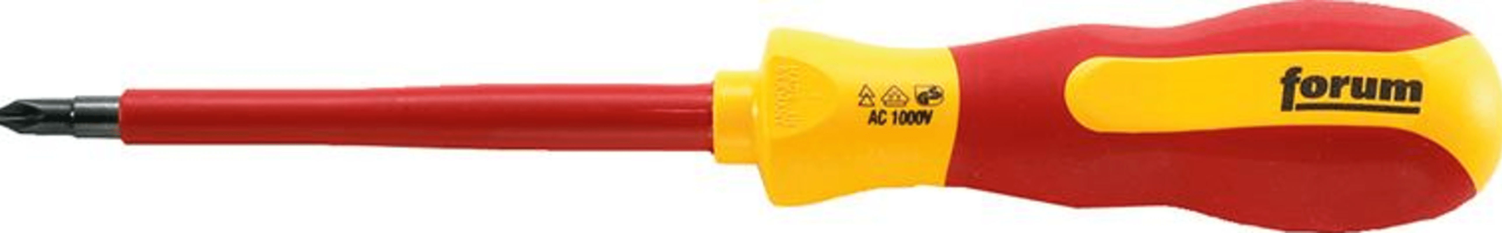 FORUM VDE-Kreuzschlitz-Schraubendreher (Phillips)Mit runder, isolierter Klinge. Stückgeprüft gemäß IEC 60900.Klinge aus hochwertigem Chrom-Vanadium-Molybdän-Stahl, mit schwarzer Präzisionsspitze. Mit ergonomischem Mehrkomponentengriff und Abrollschutz.