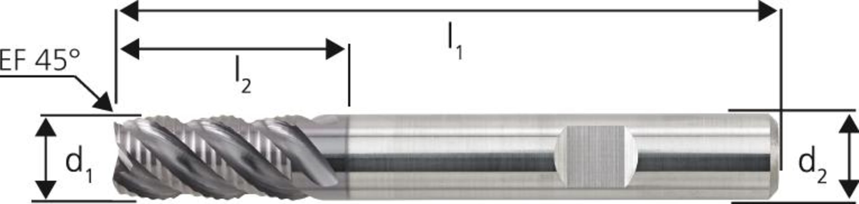 FORUM Vollhartmetall-Schruppfräser für die INOX-Bearbeitung UF, TiAlN, Typ HR, 45°, lang, Schaft HBNach Werksnorm, mit Zentrumschnitt. Schnittgeschwindigkeit ca. 50 % höher als bei unbeschichteten Werkzeugen. Trockenbearbeitung möglich. Einsetzbar zum Schruppfräsen. Die feine Kordelverzahnung produziert kleine, leicht zu entfernende Späne. Hierdurch wird eine Verbesserung der Standzeit am Werkzeug sowie eine bessere Oberflächengüte erzielt.