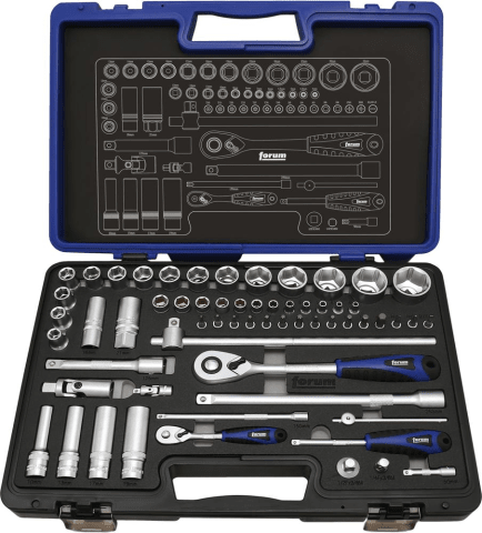 Steckschlüssel-Garnitur 1/4" und 1/2"• Seidenmattes Finish für eine blendarme Oberfläche • Qualitätsstahl C60 • Griffige Kreuzrändelung • Gestempelt Lieferung: Im Kunststoffkasten mit 2-farbiger