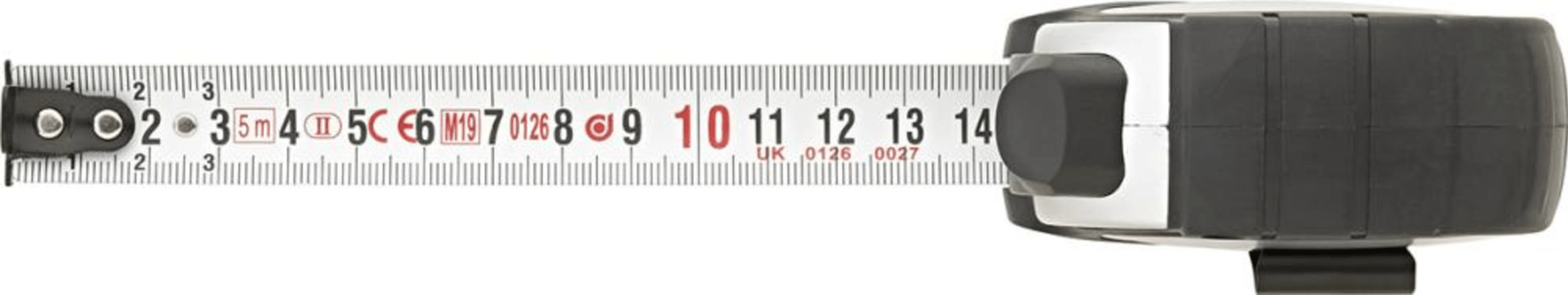 Taschenbandmaß, Autolock• Stoß- und schlagfestes Kunststoffgehäuse mit Teil-Gummiüberzug • Stahlband, weiß • Nylonbeschichtet (verhindert Korrosion und erhöht die Abriebfestigkeit) • mm-/cm-Teilung