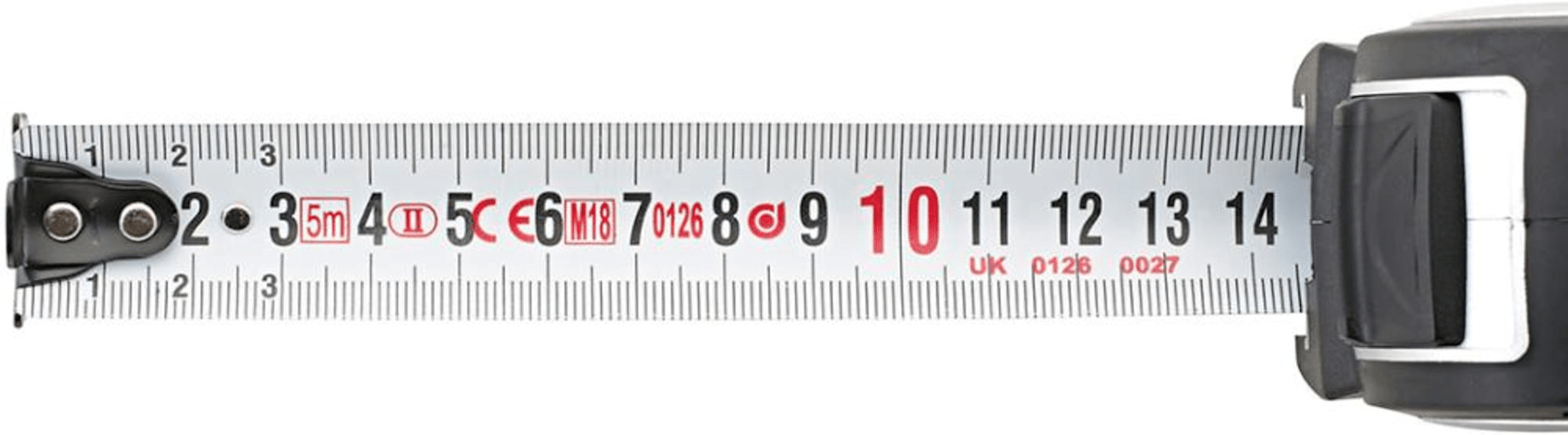 Stoß- und schlagfestes Kunststoffgehäuse, Teil-Gummiüberzug sowie griffiger Feststellbremse. Weiß lackiertes Stahlband, nylonbeschichtet verhindert Korrosion und erhöht die Abriebfestigkeit, mm/cm-Teilung. EG-Genauigkeitsklasse III.