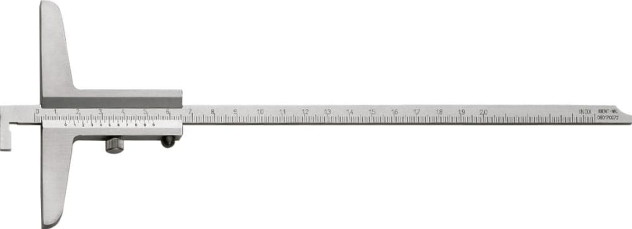 Tiefenmessschieber mit abgesetzter Messstange• DIN 862 • Stahl, rostfrei • Nonius und Skala matt verchromt • Mit Feststellschraube • Doppelseitige Teilung zum Umstecken der Messschiene zum Normal-
