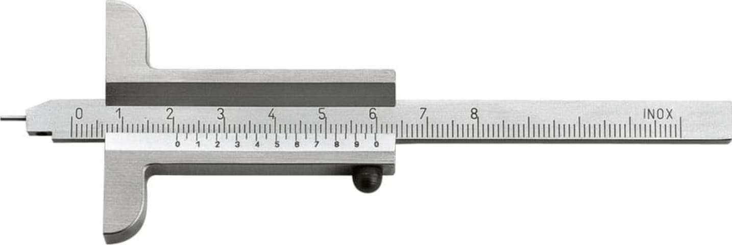 Tiefenmessschieber mit Messstift• DIN 862 • Stahl, rostfrei • Nonius und Skala matt verchromt • Mit Laser-Skalierung • Mit Feststellschraube • Mit gehärtetem Messstift Lieferung: Im Kunstledere
